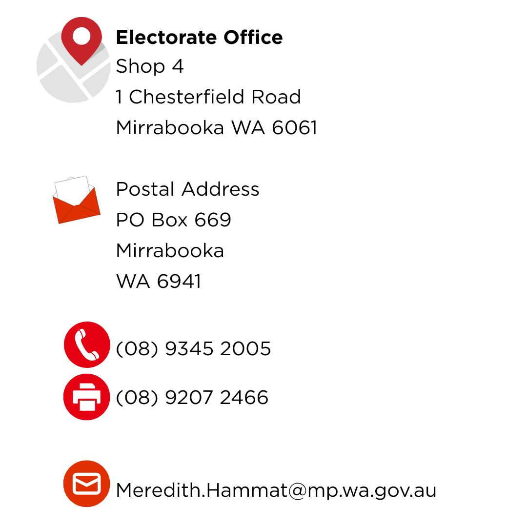 If you reside within the Girrawheen electorate (Alexander Heights, Balga, Girrawheen, Koondoola, and parts of Marangaroo and Mirrabooka), please complete our contact form.